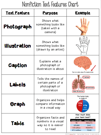 An overview of basic nonfiction text features: Title, subtitle, table of contents, chart, graph, table, captions, diagram, labels, map, . Don't ignore the pictures and labels when you read nonfiction. Swbat apply their knowledge about the text feature of labels to label their own pictures . Examples of nonfiction text features include captions, index, and glossary. Text features worksheets ~ these non fiction reading comprehension passages and questions are designed for 2nd, 3rd, . When we question our students about text features, we often focus too much on having students identify different nonfiction text features. Different types of nonfiction text contain common features that students can recognise and use to help them understand the information being presented, . Identifies the topic of the text/tells what the text will be about. To further reinforce identifying the . If the anatomy of an animal is vitally important to understanding a text, a detailed photograph with labels gives the reader the support he needs to comprehend . Check out this lesson from a classroom teacher who uses common sense education. In addition to these complexities, expository nonfiction also contains numerous text features that supplement and present important content that the student .
